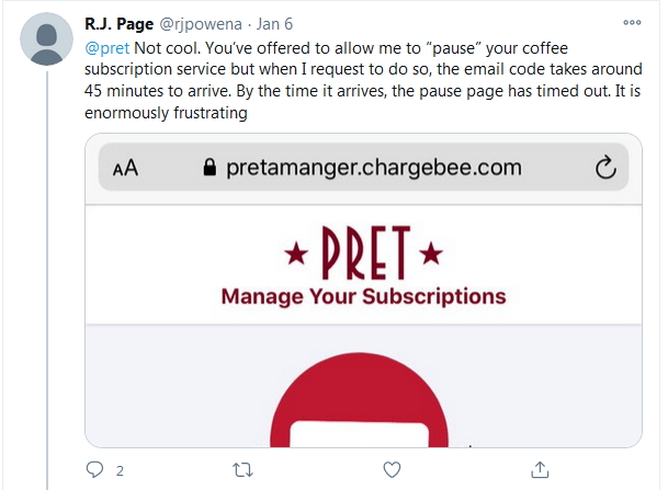 The coffee subscription issues continue with daily Tweets and Insta/FB posts on customers either not able to cancel before the new month starts, wrong expiration dates which forces customers to another month of subscription, or even worse they DID cancel in time and they even received a confirmation email that they’ve successfully cancelled, but Pret keeps withdrawing money from people’s bank accounts the following months. Pret doesn’t respond to emails or customers suddenly get cut off when they DO manage to get through on the phone etc. etc. etc. So, people flock to public feeds on social media and only THEN does Pret respond luring them into DM … A news article covered this after I kept RT’ing and posting about the rip-off (below YouTube slide).