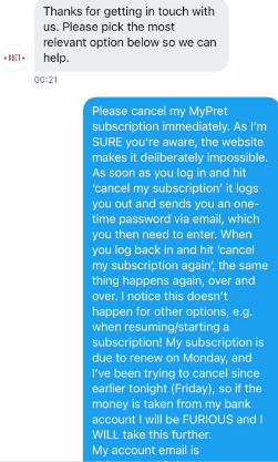 UPDATE July 2021 Pret STILL makes it hard to cancel and continues to take money! No company can have THAT MANY issues for SO LONG! Just a few only from Twitter, I didn’t bother to screenshot any more from Instagram and Facebook: