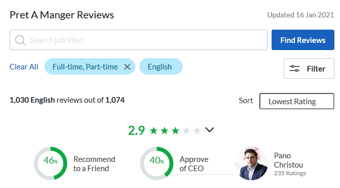 A 2019 staff review from New York, from an all-rounder employee doing different tasks as Pret chronically under-staffs to maximize profit: