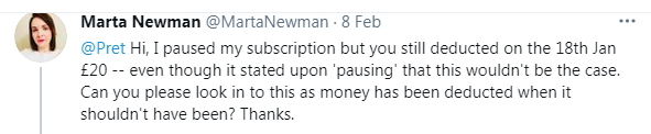 A customer cancelled her subscription in August 2021 and realized now that Pret continued to charge her, altogether ยฃ210. From all the complaints I’ve seen on social media, there have been several who were charged 3, 6+ months after cancellation, but this is the longest, almost 9 months. And not all customers complain publicly, only Pret know how many complain via email/DM or even try to get through via phone where Pret seldom pick up.