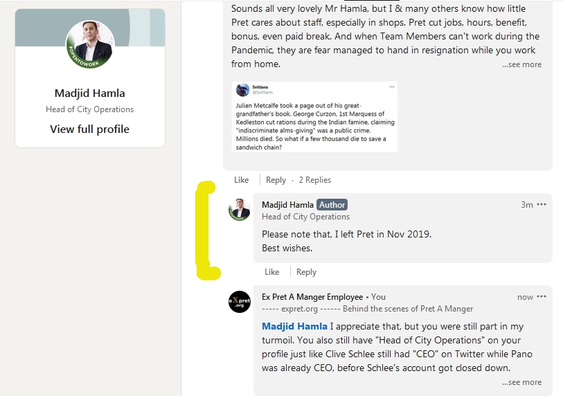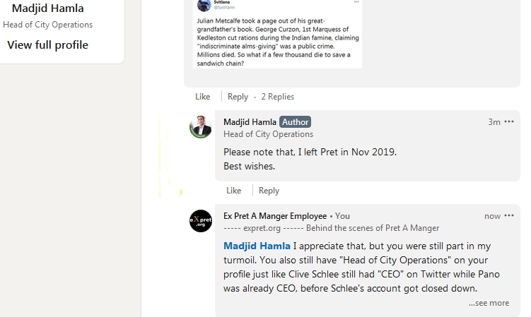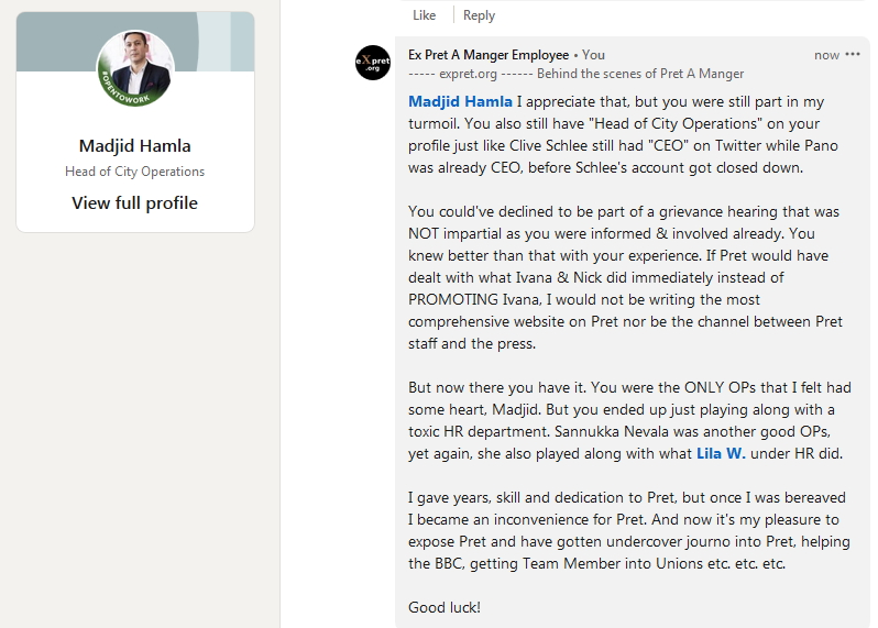 Madjid’s response is a typical Pret A Manger cop-out: He left Pret in 2019, therefore he doesn’t feel responsible anymore while still posting Pret-related stuff. Good try Madjid, try again. But I understand that Madjid worked over 25 years in Pret. And that is why he is AS responsible as anyone from the executive team. Clive Schlee is still hiding, in hopes grass continues to grow …