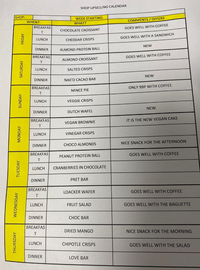 A recent weekly up-sell rota on which item is supposed to be offered at what time of day: