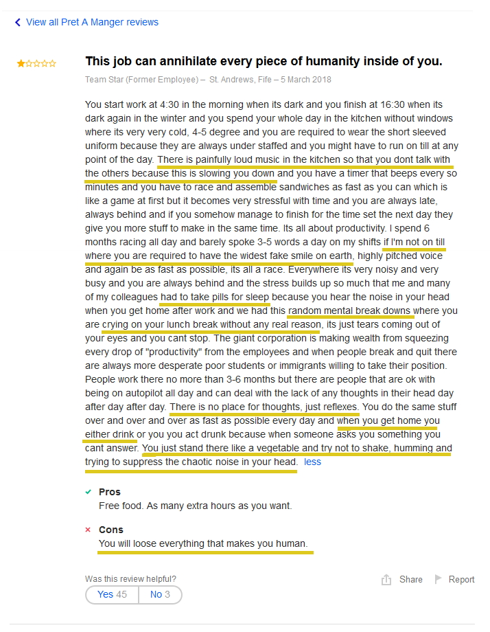 The MOST poignant staff review that painfully explains a day in Pret. I can underline every dot and comma of this review. I highlighted a view things and put the link underneath.