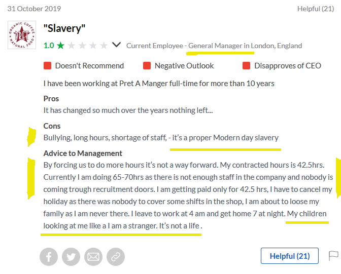 Some of the many staff reviews with an email by a current Pret shop staff I’ve put on YouTube as my blog is censored on Facebook and Instagram, I use YouTube and all other media to spread the word how Pret really is behind that “happy” facade: