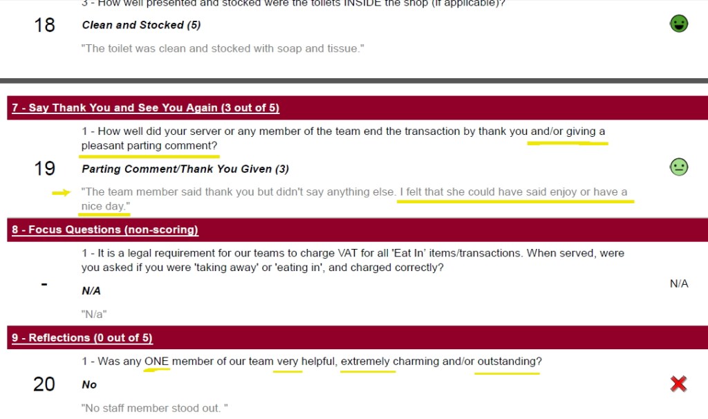 Mystery Shopper Screenshots: (I highlighted and marked in yellow or red a few things to explain the horrible expectation by multi-millionaires to squeeze the last drop out of workers to present a happy facade).