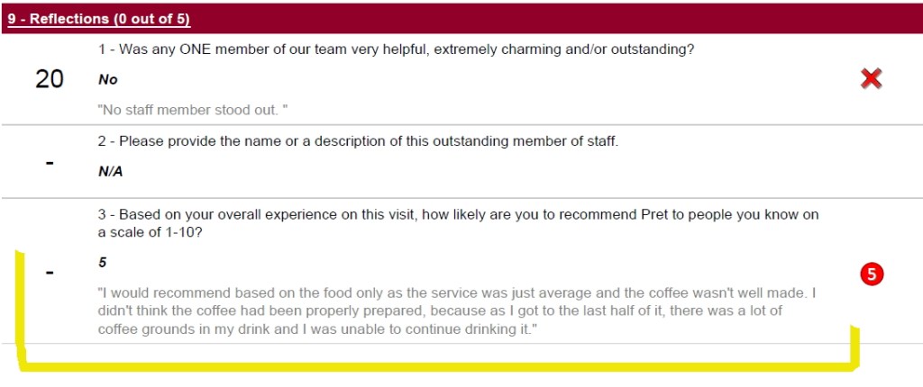 I write this new blog entry because several customers have complained to Pret on Twitter that they don’t want to be asked again and again if they want to buy anything extra. Unfortunately customers don’t appreciate the immense stress and the target for staff to have to up-sell or lose bonus. In below screenshots from a December 2020 MS report, people can see the perfect example of a shop that lost bonus BECAUSE the Team Member (TM) did NOT up-sell the way Pret demands and the fussy Mystery Shopper expected. This particular Mystery Shopper was especially ignorant and arrogant, expecting staff to stretch in all directions.