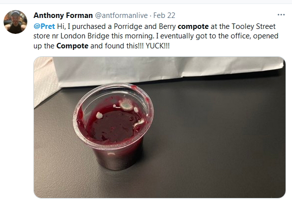 Or recently 2 customer complaints from 2 different shops within 1 week of berry compote with mould: