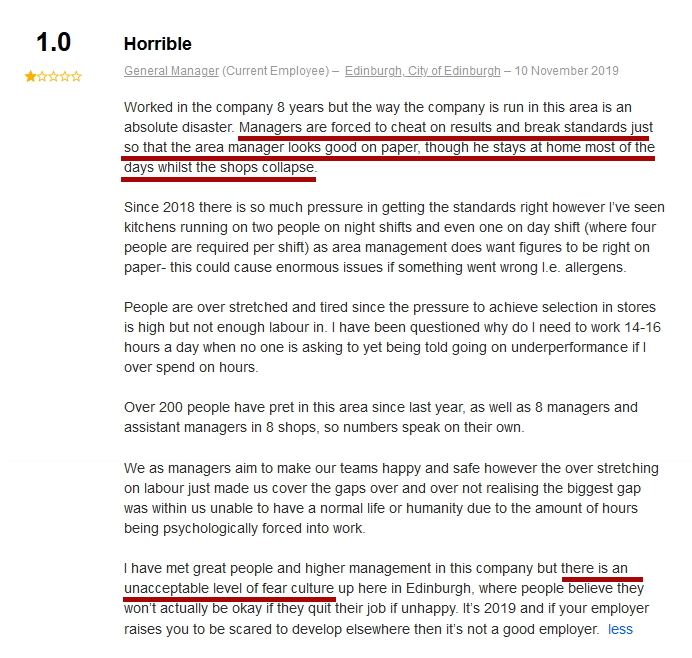 Some recent staff reviews on Glassdoor and Indeed where staff have the courage to speak out freely in anonymity. I marked some in the screenshot.