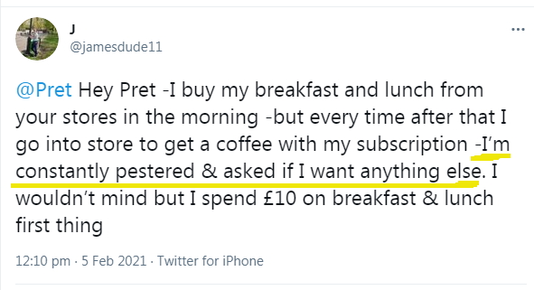 And part of a leaked Zoom call video I was sent and passed on to the BBC that later reported on Pret’s “job situation” when it was announced that employment cuts were coming up. In this clip I cut out from the full video, UK Managing Director Clare Clough explains the “Attachment Rate” which is where customers buy extra items when they get a coffee on a subscription service, or in this case with the “20 coffees for ยฃ20” voucher. Since the pandemic and loss of profit staff HAVE TO up-sell because that’s where the money comes in.