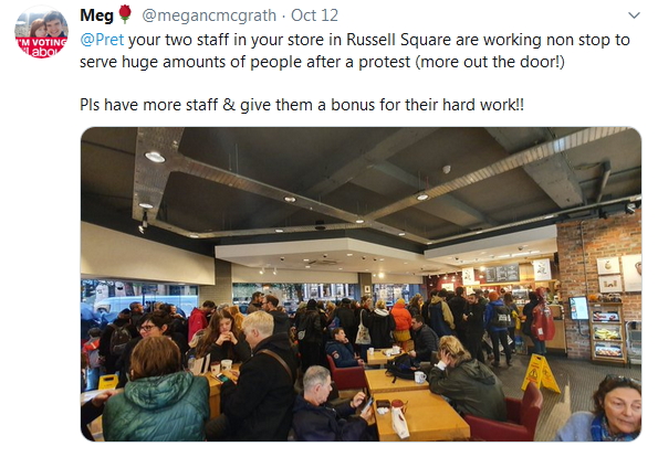 I always told my colleagues that the best way to describe Pret A Manger’s work expectations and conditions is, that they bind the feet of staff and then demand them to run. And if they fall, they get penalized. I keep saying again and again to join a Union and strike. If McDonald’s and Amazon workers and maybe soon NHS workers can do it, Pret staff can. They just need to find the strength and courage to look beyond the brainwash and fear management. But maybe they’re not angry enough yet.