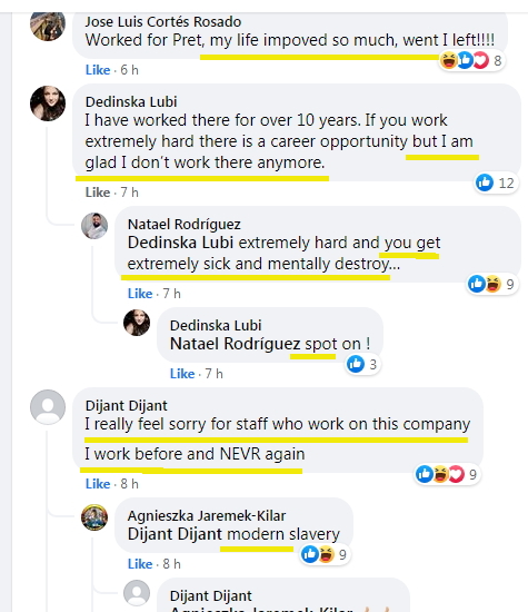 Some comments on Facebook that Pret leaves in as only good comments would look fishy. Also, see how many people “laugh” about it in the “like” section. Some I recognize as former staff, most likely all of them are former staff, one is even angry:
