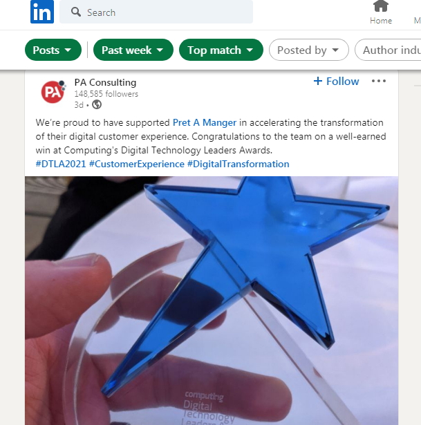 Quote from PA Consulting on Linkedin: “We’re proud to have supported Pret A Manger in accelerating the transformation of their digital customer experience. Congratulations to the team on a well-earned win at Computing’s Digital Technology Leaders Awards…”