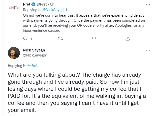 So, today’s lie regarding the QR code delay is that the payment hasn’t gone through yet, even though some customers have been waiting for days. Many people give Pret the benefit of the doubt and PAY in-store for a coffee. Some are lucky and get a free coffee (not free as they already paid for it via the sub). But many others end up paying.
