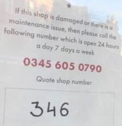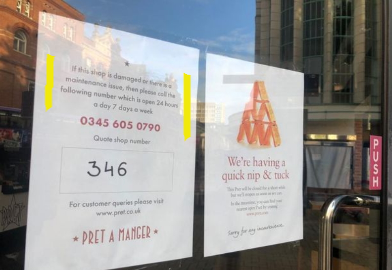 Pret not only lies about the nip and tuck, they also have the audacity to “employ” the public to report a damage or maintenance issue and act as security guards! A typed out template where Pret staff just hand write the shop number in, shows how organized and premeditated this is. Side-note: The shop number here is not the number of the street address but the number of the shop Pret opened. In this case this is Pret’s 346th shop they opened.