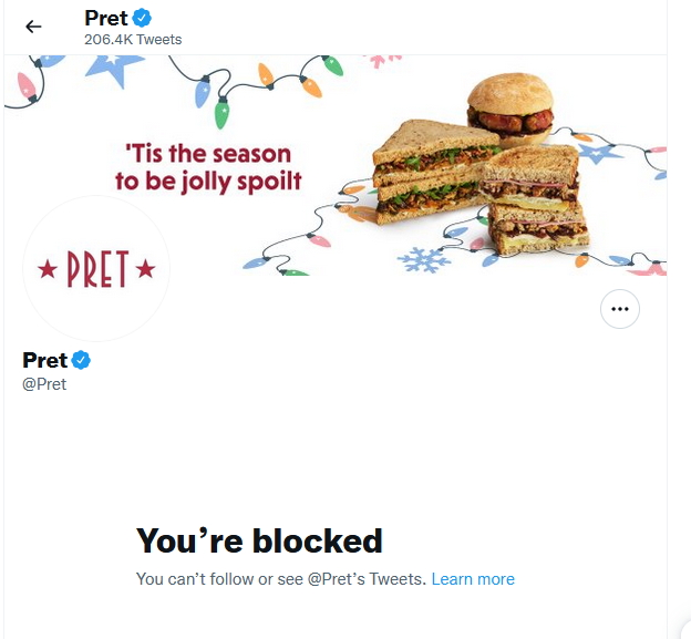 As of 26th November 2021 I’m delighted to say that Pret has FINALLY blocked me on Twitter!!! As Pret shops are in shambles and countless customer complaints flood in which I keep posting on YouTube etc. they finally decided to slam the door! Muhahahahaaaa!!! ๐ ๐คญ ๐ ๐