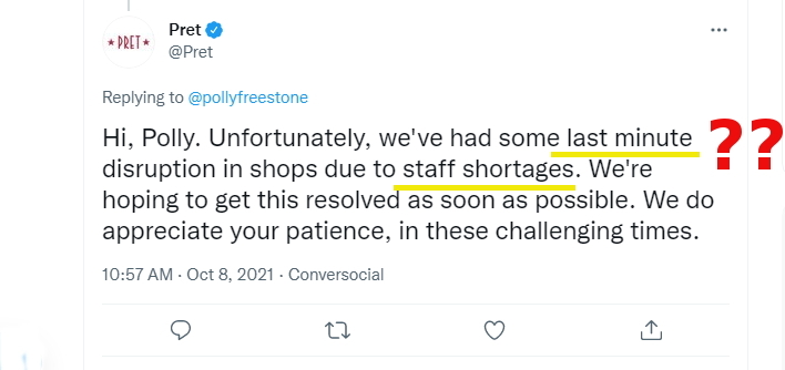 . A Tweet that unfortunately has been deleted, but is spot on! I had a VERY proud day! A very, very proud day indeed! After three and a half years of writing on Pret, mainly staff issues but also other issues, Pret has now disabled commenting for me on their Instagram and Facebook post from … Continue reading Last minute?? Staffing Disruption @ Pret A Manger 🤣😃😂.