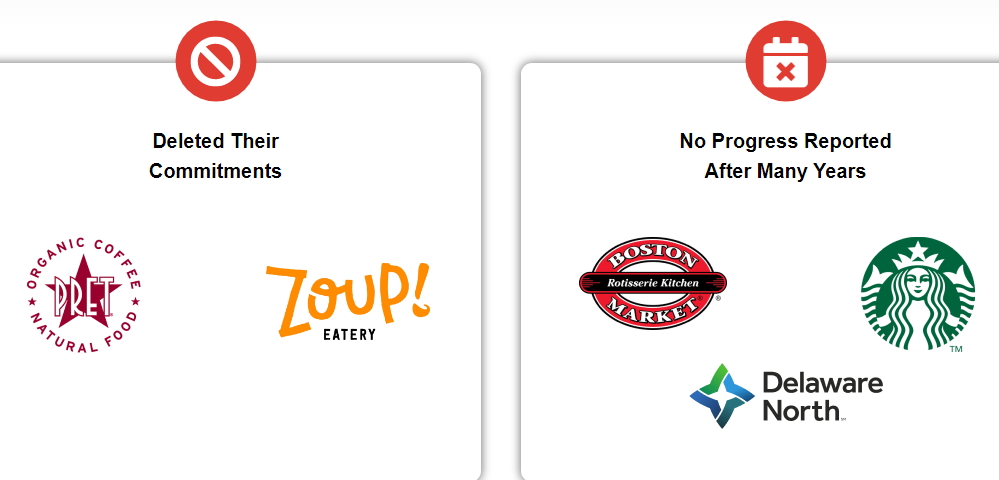 “The following companies have failed to report measurable progress toward their broiler welfare goals and have deleted their previously public policy commitments:
