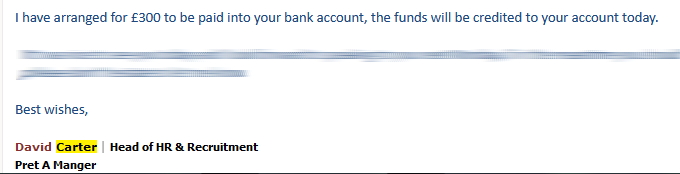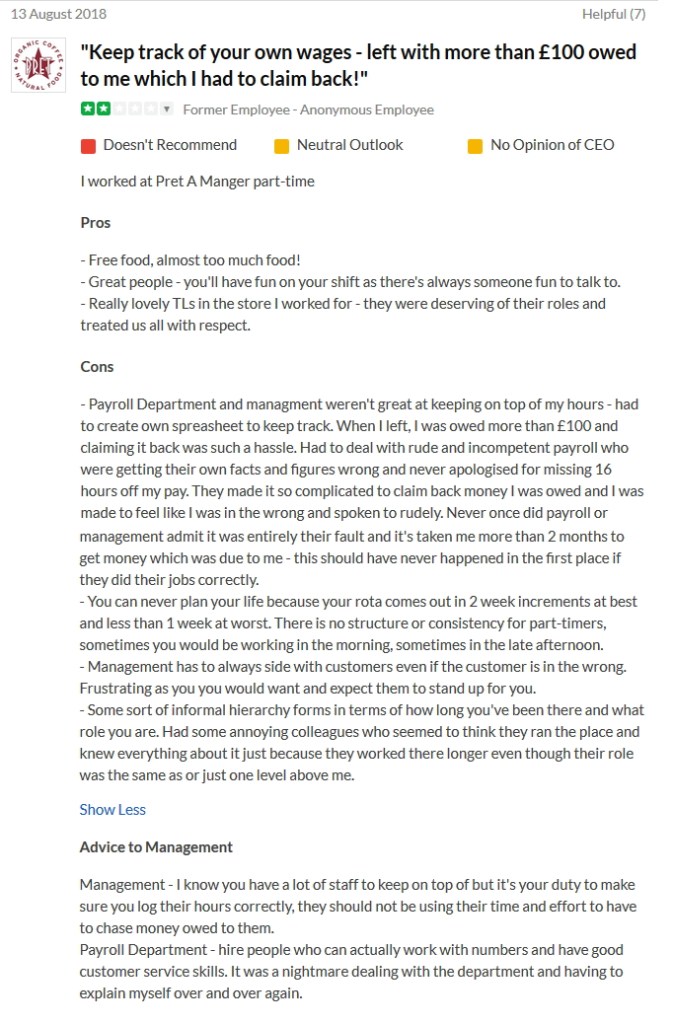 The same with last week’s pay. I myself have not been paid for a whole week when I left Pret. When a team member starts in Pret, they don’t get paid for the first week. They get the first week pay on the end of week two. And then when they leave, Pret forgets to pay it back.