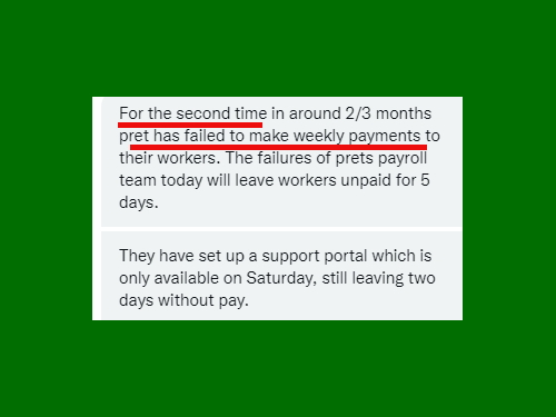 Days before the Queen’s platinum Jubilee weekend I was contacted by someone informing me that Pret delayed paying their lowest paid shop staff for the second time this year.