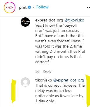 Upon my question to above Instagram person who’s staff, if it’s true that Pret for the SECOND time recently didn’t pay staff on time, the answer was, quote: “That is correct, however the delay was much less noticeable as it was late by 1 day only.”