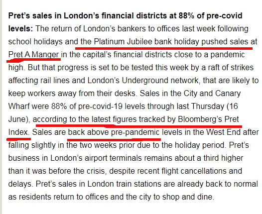 For one, how can sales be up 88% to pre-pandemic levels when more and more customers boycott Pret, with many vowing to never set foot inside Pret again after learning how Pret exploit staff. Plus, shops have shorter opening times due to lack of staff. How do they throw around with figures like that?