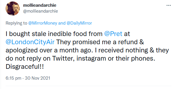 “Pret have started keeping their food overnight and selling it the next day. Considering they’ve built their entire brand on the Freshly Made slogan it’s very misleading. They’ve also slowly started removing all the freshly prepared signs from their stores hoping no one finds out.”