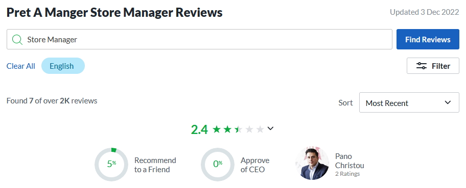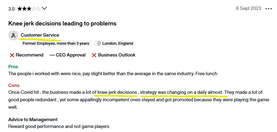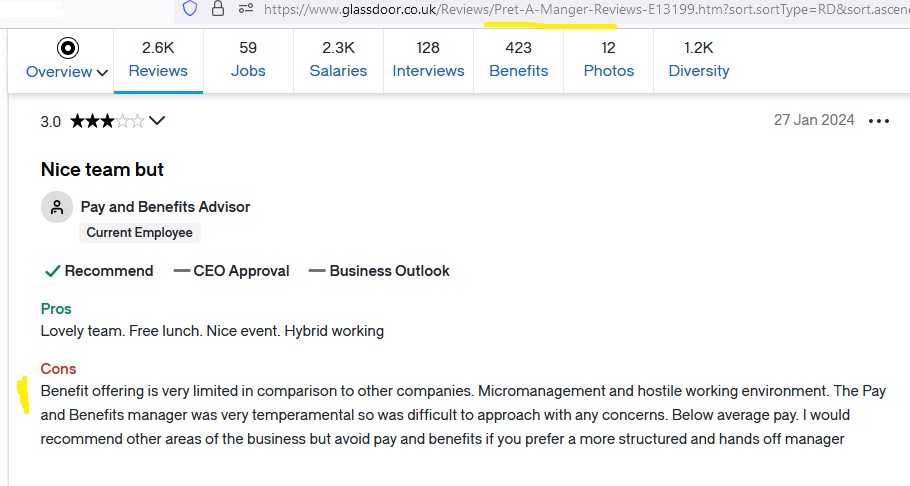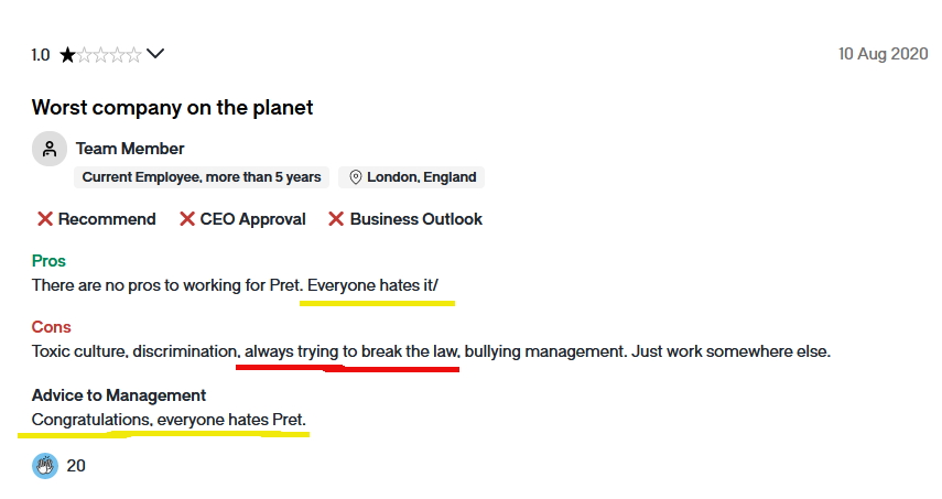 (Side note, I completely agree with this review from experience. When I worked at Pret, even as lower ranked shop staff, it was so visible that they always changed direction at short notice and wasted so much money on wrong decisions that we had to undo/fix due to poor decision making. We will see this also in another review from an office staff from New York further below. And that’s not only since Covid, Pret execs are incapable to lead with sovereignty and a secure stand. And Pano Christou has the reputation with staff to not have direction or vision. Of course not! He’s just the puppet for JAB Holdings!)