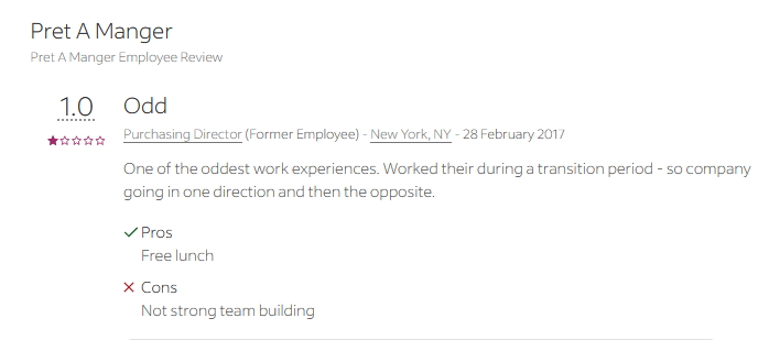 Also important to note is that many, if not most, higher up positions in Pret USA are imported from the UK. Many American reviewers mentioned this and are furious about it. ยปGenerally a poor relationship with UK leadership, no support. … Senior management has no clue what people do and hires external people with no industry experience. … Senior leadership does whatever they want, if you are in the right clique.ยซ