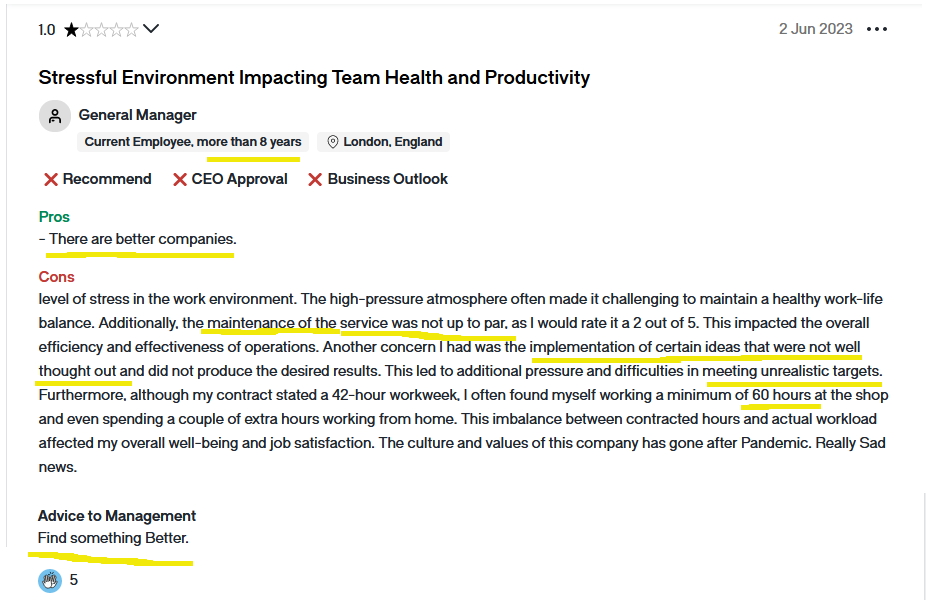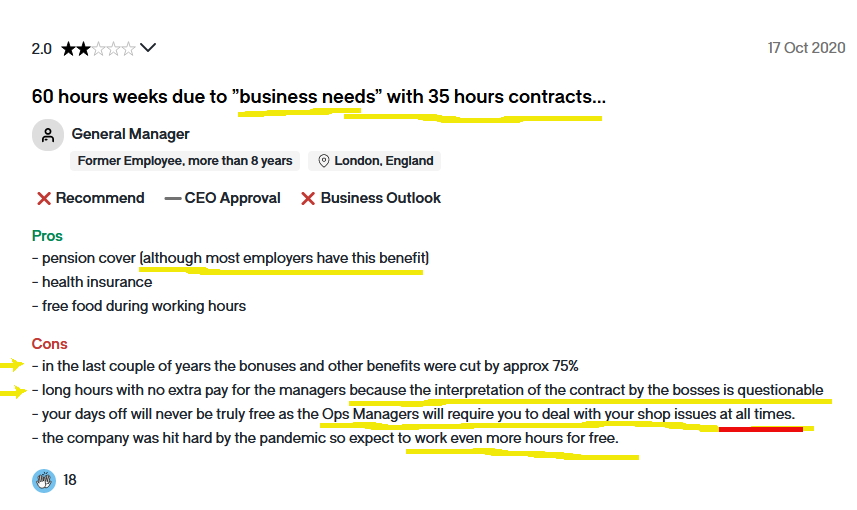 I stop here as I wanted to concentrate on shop managers, OPs managers and HQ staff. But there continues to be more reviews as well as social media posts from staff along those lines.