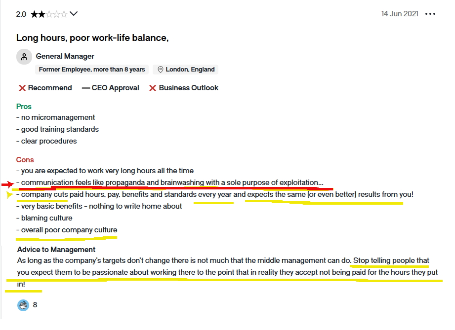 ยปyou have to work 10h+ sometimes no days off for a pat on the back. … Advice to CEO: more kindness like they advertise everywhereยซ