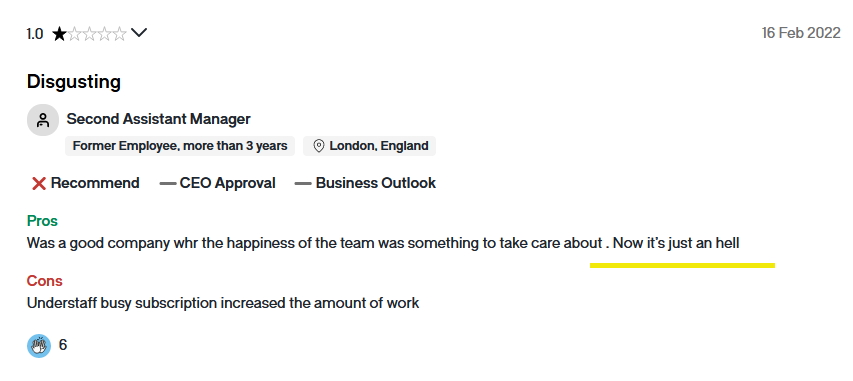 ยปRuthless race for profit – Quick career progression – unfortunately due to high turnover … CEO is very not proactive to investigate situations in the shopsยซ