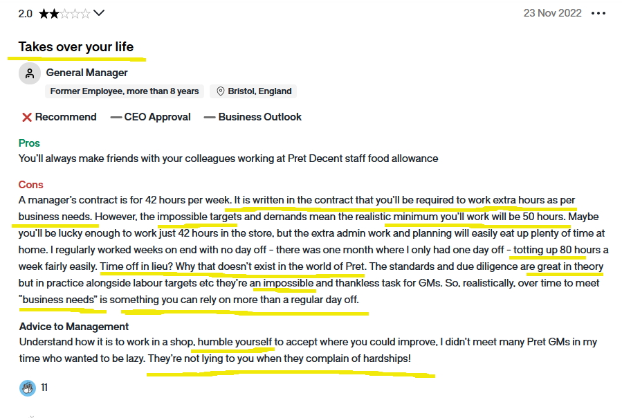 And that’s the thing, the same with team members, Pret advertise “higher” pay (50p above minimum wage) and some perks, but of course fail to mention that they will force and manipulate all staff to work overtime for free. With all the hours people work, it’s way BELOW minimum wage and borders on slavery-type work conditions. And this in turn affects food safety.