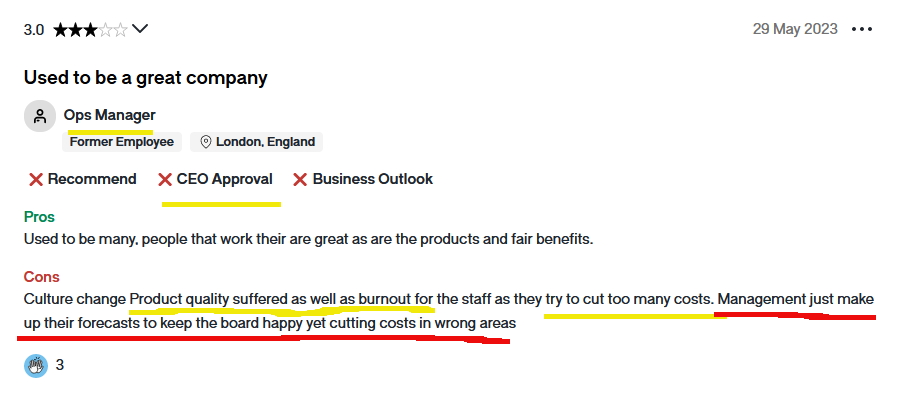 I noticed that only since the pandemic OPs Managers (area managers) and more HQ staff started to write reviews. Especially OPs Managers who get a sh!t-load of money and bonus usually stay quiet. But since around 2021-ish OPs and Group Manager reviews started to pop up. The pandemic has started to really squeeze everyone (except the CEO of course).