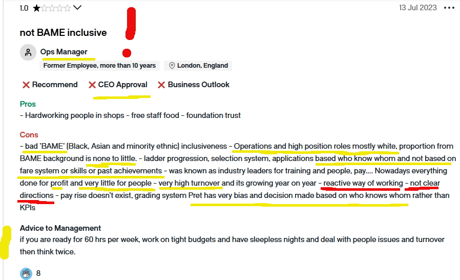 There are more reviews like this about no clear direction. And myself having been to HQ many times, I underline this, you hardly see staff from the Black, Asian etc. community. And most Caucasian British, German, French either work in head office or as OPs. In my 10 years in Pret in over 30 shops, I only worked with 3, no more than 5 Black or Asian Managers/OPs while especially the cramped kitchens are filled with BAME and Eastern Europeans.