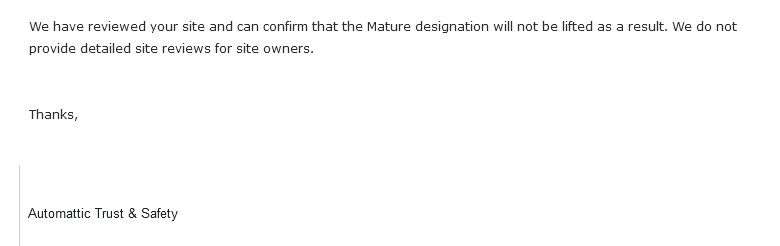 “We have reviewed your site and can confirm that the Mature designation will not be lifted as a result. We do not provide detailed site reviews for site owners”