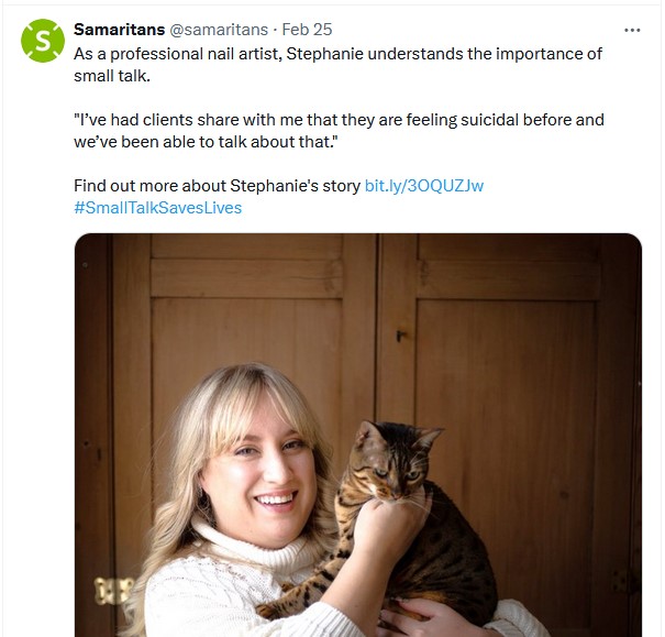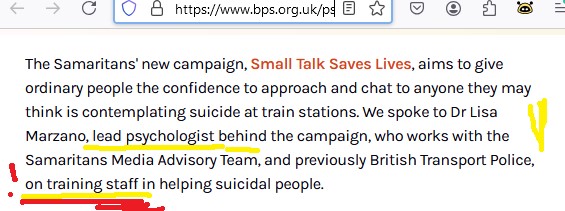 Quote: “We spoke to Dr Lisa Marzano, lead psychologist behind the campaign, who works with the Samaritans Media Advisory Team, and previously British Transport Police, on training staff in helping suicidal people.”