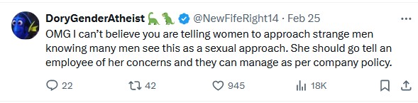 One tweet gave the CORRECT approach and it’s appalling that Samaritans want women to approach strangers assuming severe mental health issues. Help someone as a group.