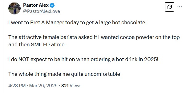 UPDATE 2025 – The above comment is shown in black and white on a Pret A Manger Twitter comment by a pastor who assumed he was “hit on” by a female staff member because she smiled at him. For one, I educated him that Pret staff HAVE TO smile, or no-one gets bonus, and 2. the fact that some men take a smile, let alone initiation of small-talk as a hint …nothing more to say.