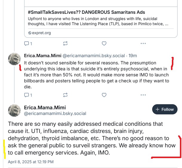 One guy on X tried to guilt-trip me, and make me responsible if a man dies by suicide. I responded that I’d rather hurt his (the X poster’s) feelings than endanger my life. I made it very clear that if I think he or someone is about to end their life, I WILL call for help!
