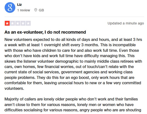 Also at the bottom of this page about the poor scoring on Trustpilot. Here’s just one of many reviews, and then it makes sense why Samaritans “recruit” members of the public: