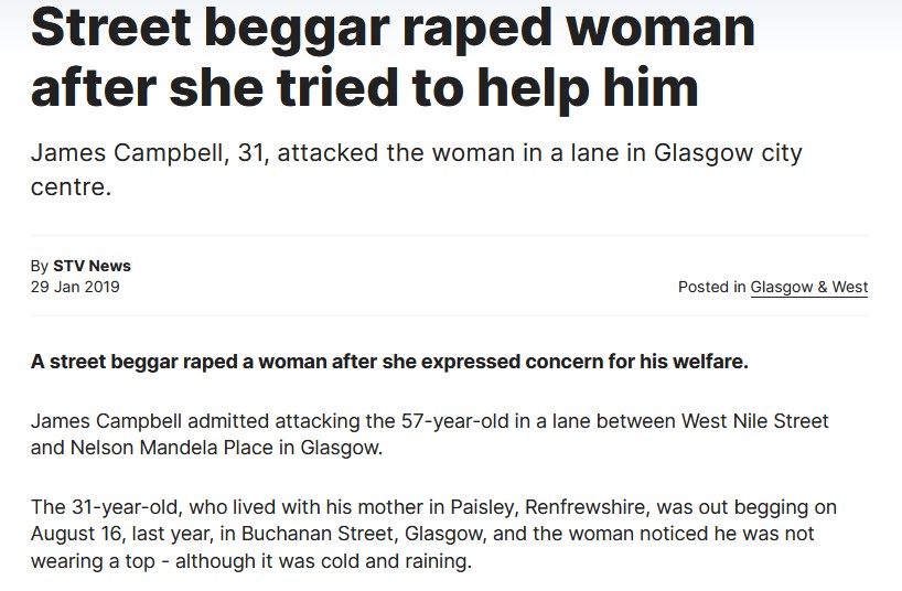 2019 Scotland: “Street beggar raped woman after she tried to help him“