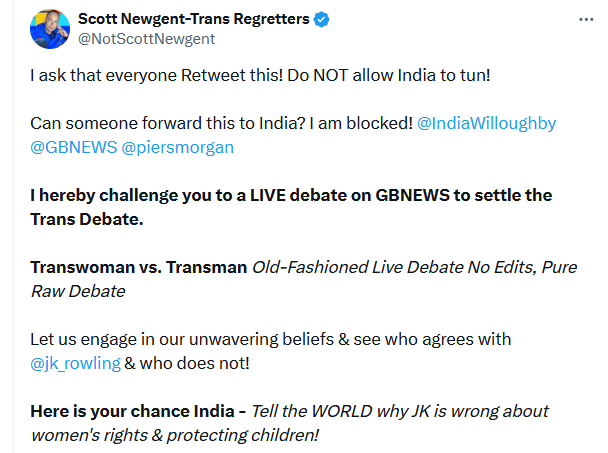 Transman and activist Scott Newgent has put out an invitation or challenge, however people want to call it, to debate transwoman India Willoughby on live TV after the huge online debacle on X/Twitter, in particular Willoughby’s obsessive aggression towards JK Rowling. I won’t link to anything as this can be easily found, also via The Telegraph and other news outlets from yesterday (02.04.2024).