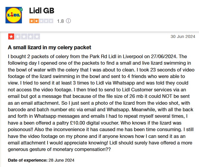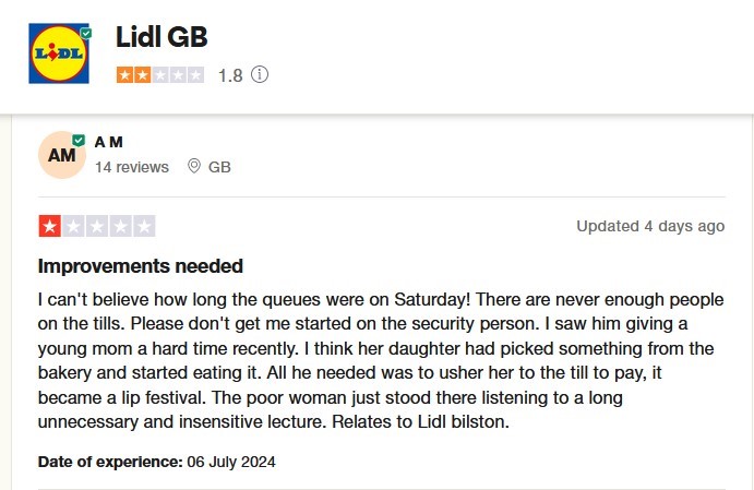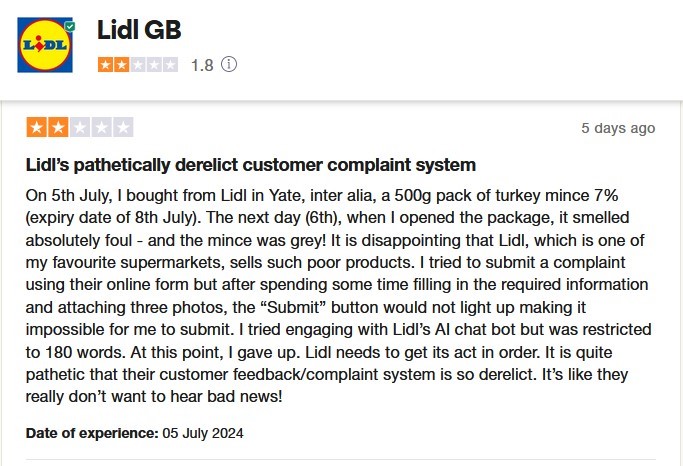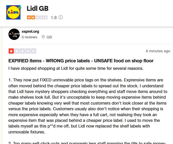 I did NOT read the Lidl reviews before I left mine. But some absolutely confirm my concerns when it comes to bad/expired food while the expiry dates are still good. I believe this is due to meat, fish, fresh drinks etc. being sat on the shop floor by customers abandoning the queues. I explain in detail WITH photos in above “Lidl Disaster” link.