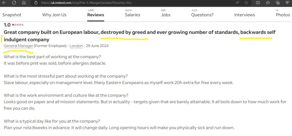 I put one of my all time favourite Pret staff reviews on a slide and zoomed in on every word as the review is in one long bulk text on Indeed, but for people to understand the sheer pressure and unnecessary micromanagement low-wage staff are under, ESPECIALLY due to the “military” style mystery shopper scheme Pret put in place. I wish I’d knew who the person is who wrote this! They deserve a blinking Pulitzer price for this review! Over the years I was contacted by former Pret staff who wrote certain reviews that I’ve put on my blog or on YouTube and they recognised their reviews. I do hope that person sees their review again in the many places I scattered it.