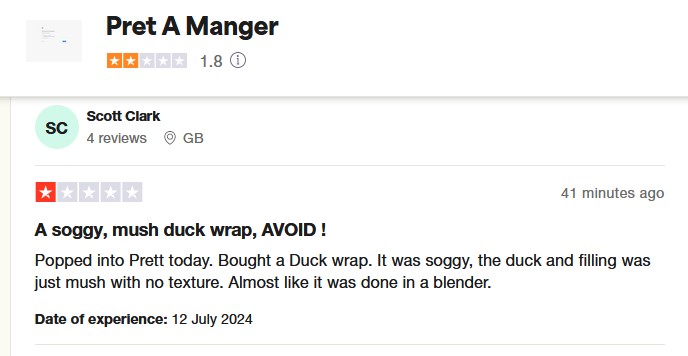 Sure, most companies have poor reviews now. Pret having 75% (1 & 2 star reviews combined) unhappy customers, but that doesn’t excuse unsafe food handling. Just because “most” companies are bad, doesn’t make it right or that we have to accept this. Such a lame excuse!