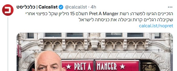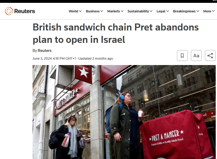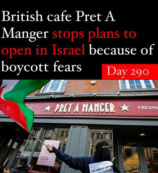 And needless to say, Pret now as of June 2024 pulled out of plans to open in Israel, giving the reason as being the war, but the real reason is thousands upon thousands of people having boycotted Pret for over a year. Some of many videos.