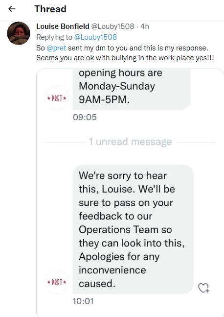 And also by the way, this Manager most likely continued the bullying later in the office, as bullying Pret managers and leaders can’t let go and continue later on, especially when caught out by customers and they “lost face” in front of the TM they just bullied. So, they try to “establish” authority and continue behind closed doors. I hope that young lady finds quick support! And if this Manager is disciplined by Pret, then only because he got caught by a customer who called him out publicly, like he did with his Team Member. If the TM alone would have complained to HR, nothing would have happened.