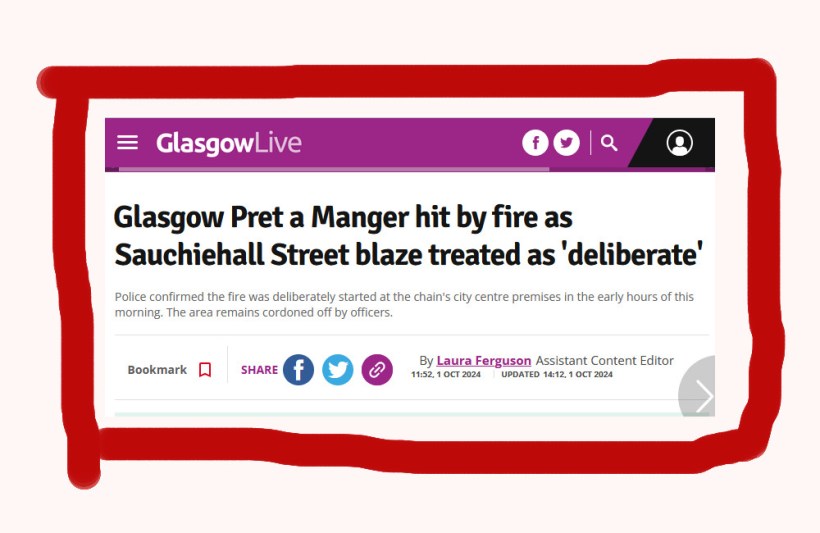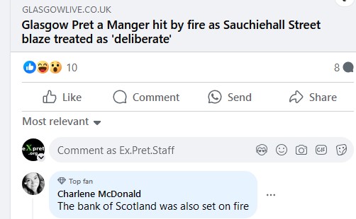 Someone on Facebook said that a branch of the Nank of Scotland a few doors down from Pet was also set on fire. But no mention by the press. This is a typical press report using Pret as clickbait. I have read the silliest reports where journlists put Pret A Manger in the title but the aticle had nothing to do with Pret. Good old clickbait. Neve gets tired I guess.