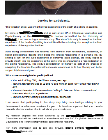 I received a request via another group I visited from a psychology student who was looking for participants of bereaved siblings. I couldn’t participate because I didn’t fit in one criteria that I needed to be in therapy while being interviewed.
