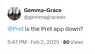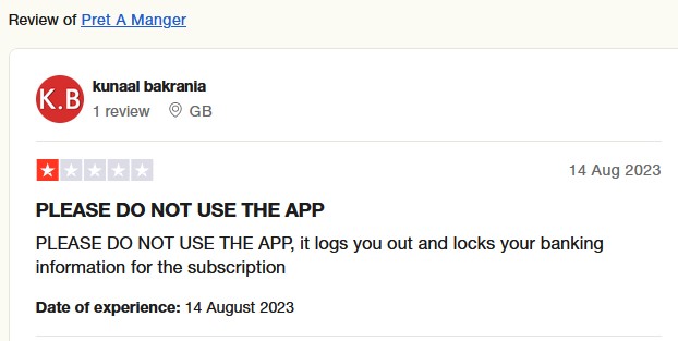 Trustpilot reviews on data issues. And not only bad reviews regarding data issues, 74% of customers on Trustpilot (1&2 star reviews combined as of January 2025) disapprove of Pret on a variety of issues, many having sworn to never set foot inside Pret again.